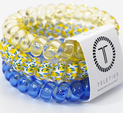 Drenched in dreamy blue hues with pops of citrusy lemon zest, the Bellissimo set gives island-in-the-Aegean energy all day long. Whether you're strolling the boardwalk in Santorini or strutting into Starbucks like it's your runway, these teleties bring just the right amount of Mediterranean magic to your look.
