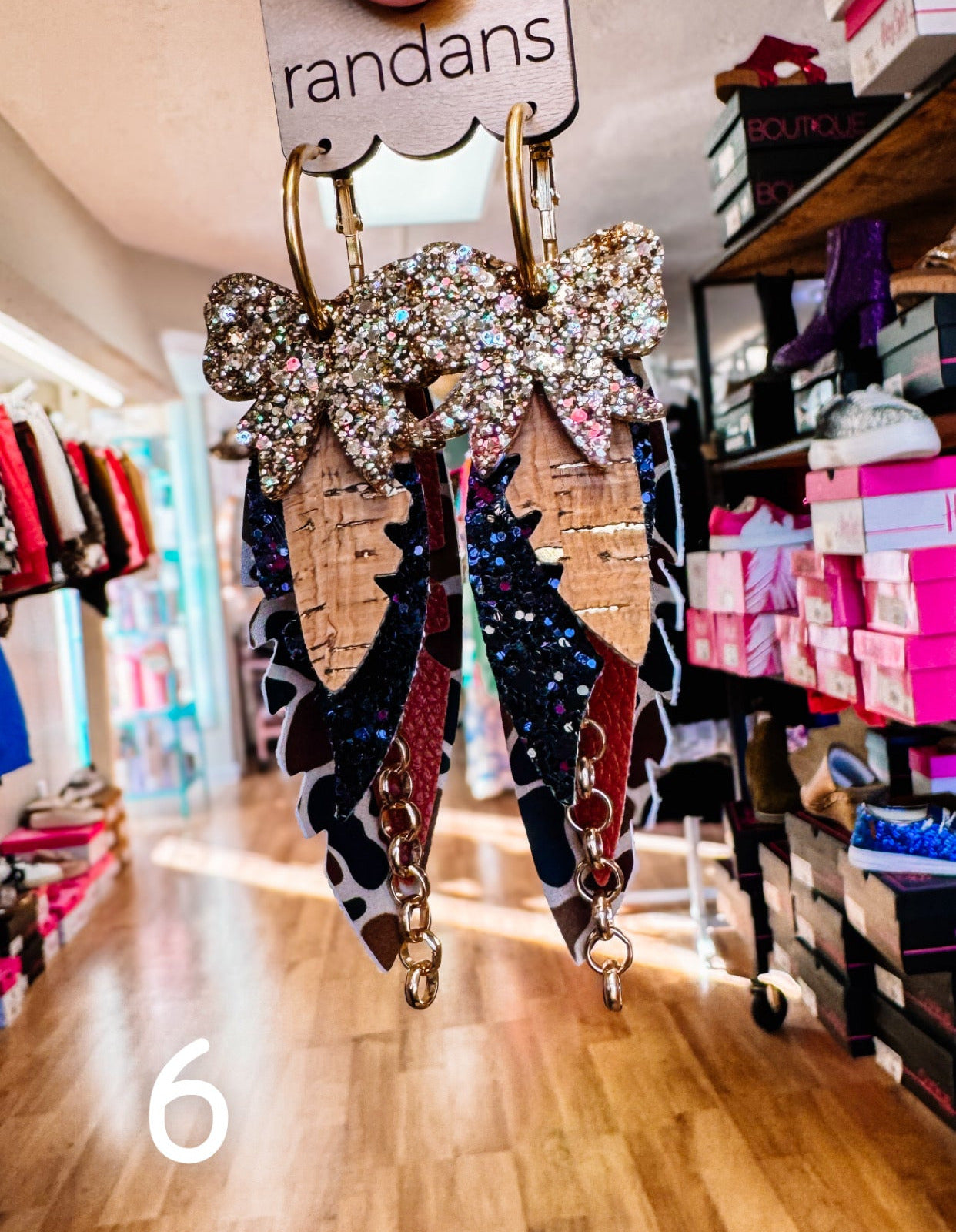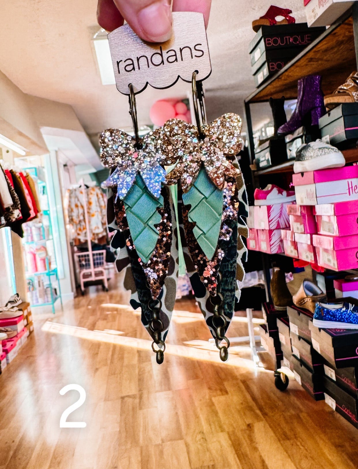 Each pair is layered with bold camo prints, chunky glitter, fierce fringe detailing, and those little chain dangles that swish with every step like your own personal hype squad. The colors POP. The sparkle is unreal. And the vibe?? Babe… it’s country chic meets boutique queen in the most iconic way.