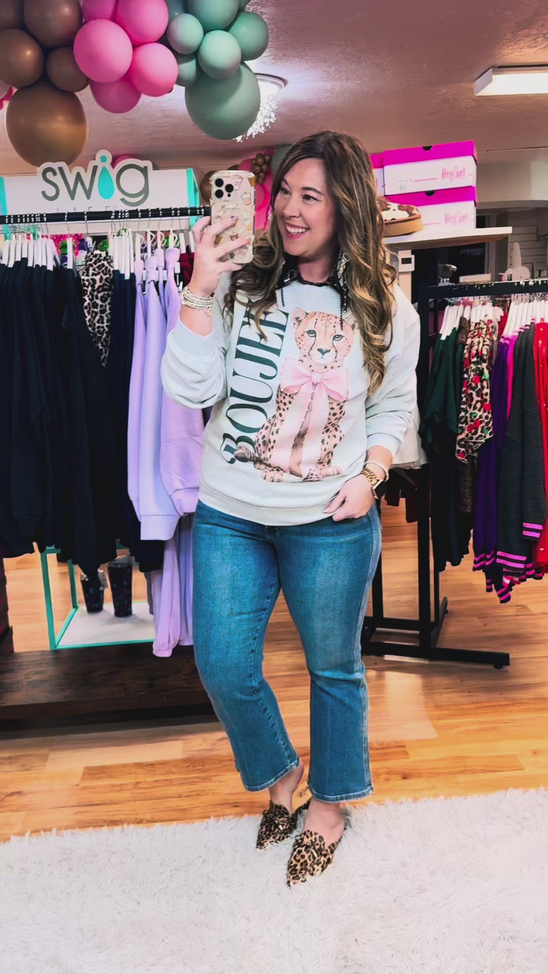The word "BOUJEE" is printed vertically in a bold, elegant serif font, leaning into the trendy, luxurious vibe that the name suggests. Whether you choose the cozy crewneck or the classic tee, this design serves as a versatile wardrobe staple. The crewneck version offers a relaxed, slightly oversized fit—perfect for pairing with leggings or biker shorts—while the tee provides a breathable, lightweight option for warmer days. Both versions are set against a heather grey backdrop, which allows the warm tones of the cheetah and the soft pink of the bow to truly pop.