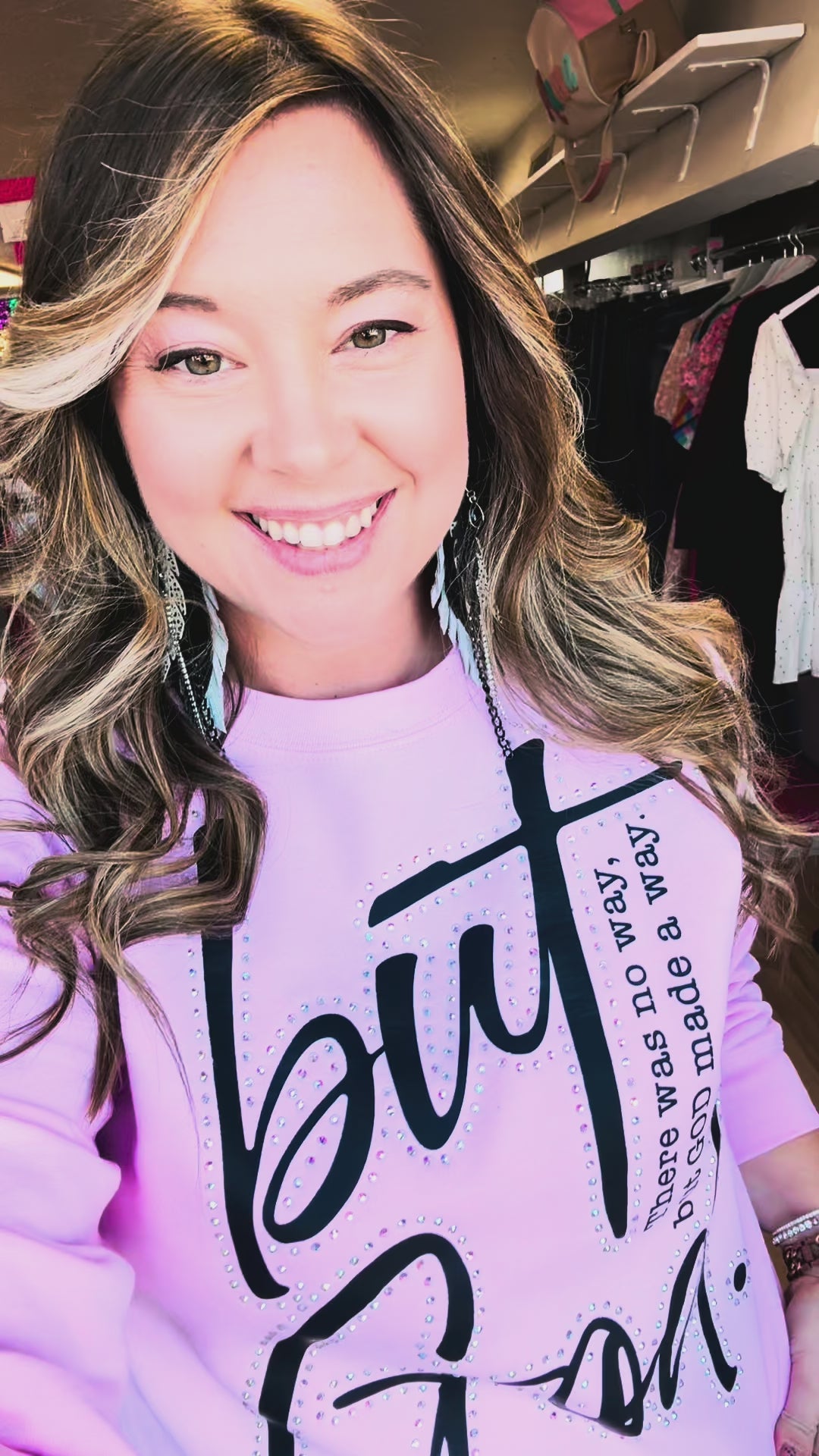 The centerpiece of the design is the bold, hand-lettered typography in deep black ink. The phrase "but God." dominates the front in a graceful, flowing script, serving as a profound reminder of divine intervention. Tucked vertically within the lettering is the supporting message: "There was no way, but God made a way," adding a layer of depth and storytelling to the piece. This combination of modern calligraphy and meaningful prose makes it more than just a piece of clothing; it’s a wearable conversation starter and a source of personal encouragement.