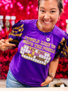 Ready to solve the fashion puzzle? Our Let the Band Play Top is bringing game day glam with a side of sass and sparkle! This bold purple beauty is for the fans who don’t just watch the game—they ARE the moment. The front features a Wheel-of-Fortune-inspired graphic with the phrase every Tiger fan loves to shout: “Let the Band Play Neck.” (You already heard the chant in your head, didn’t you?)
