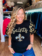 Crafted in classic black with show-stopping gold sequin leopard sleeves, this top is anything but basic. The gold tinsel script reading āSaintsā adds a dazzling dose of team spirit, while the white and gold sequin fleur-de-lis front and center seals the dealābecause you're not just a fan, you're a whole vibe. āØ