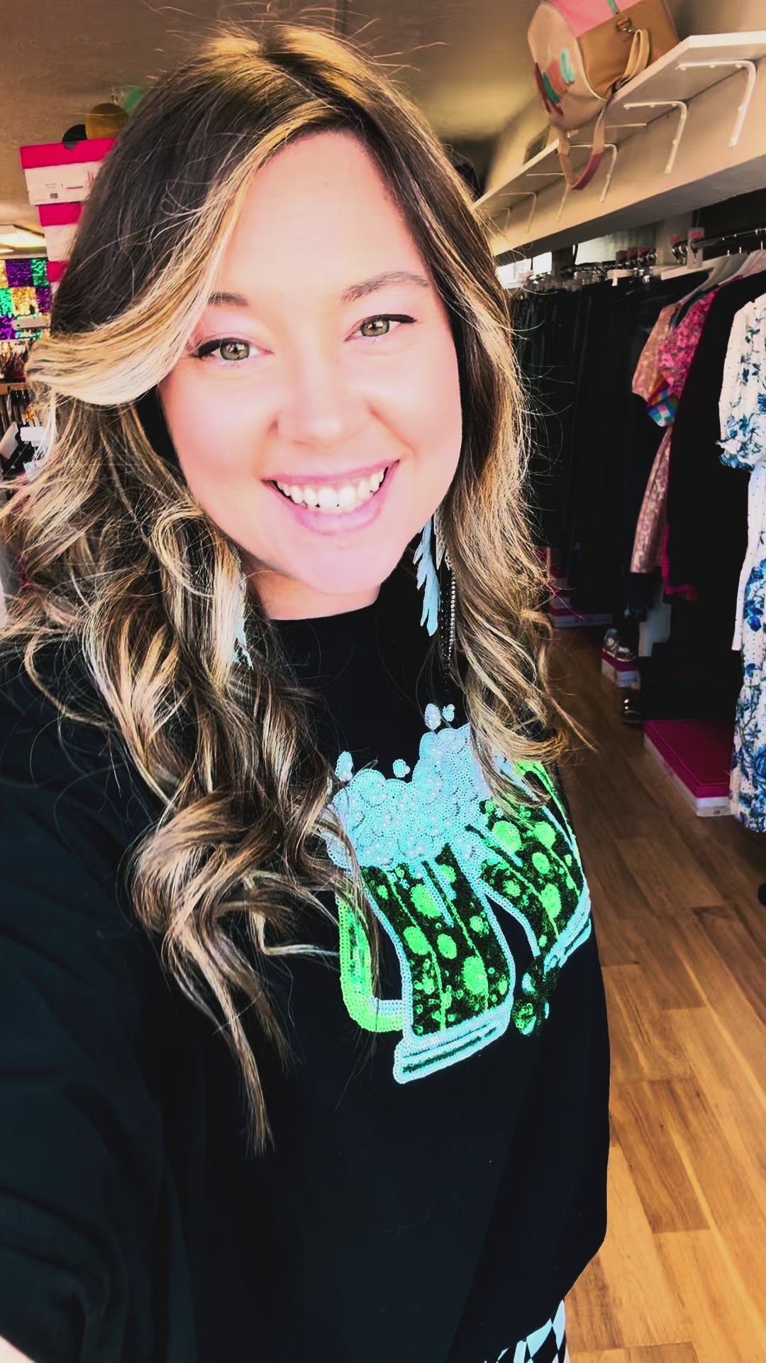 Get ready to celebrate in shimmering style with this Irish Pub Cheers top, the ultimate statement piece for St. Patrick’s Day or any festive gathering. Designed for those who love to shine, this piece features an incredible sequin and bead embellished graphic that brings a touch of luxury to your party wardrobe. The centerpiece showcases two overflowing mugs of green beer clinking in a "cheers" gesture, complete with textured, pearl-like beads that perfectly mimic frothy beer foam. A vibrant green four-leaf clover sits at the base of the mugs, adding an extra dose of luck to the design.